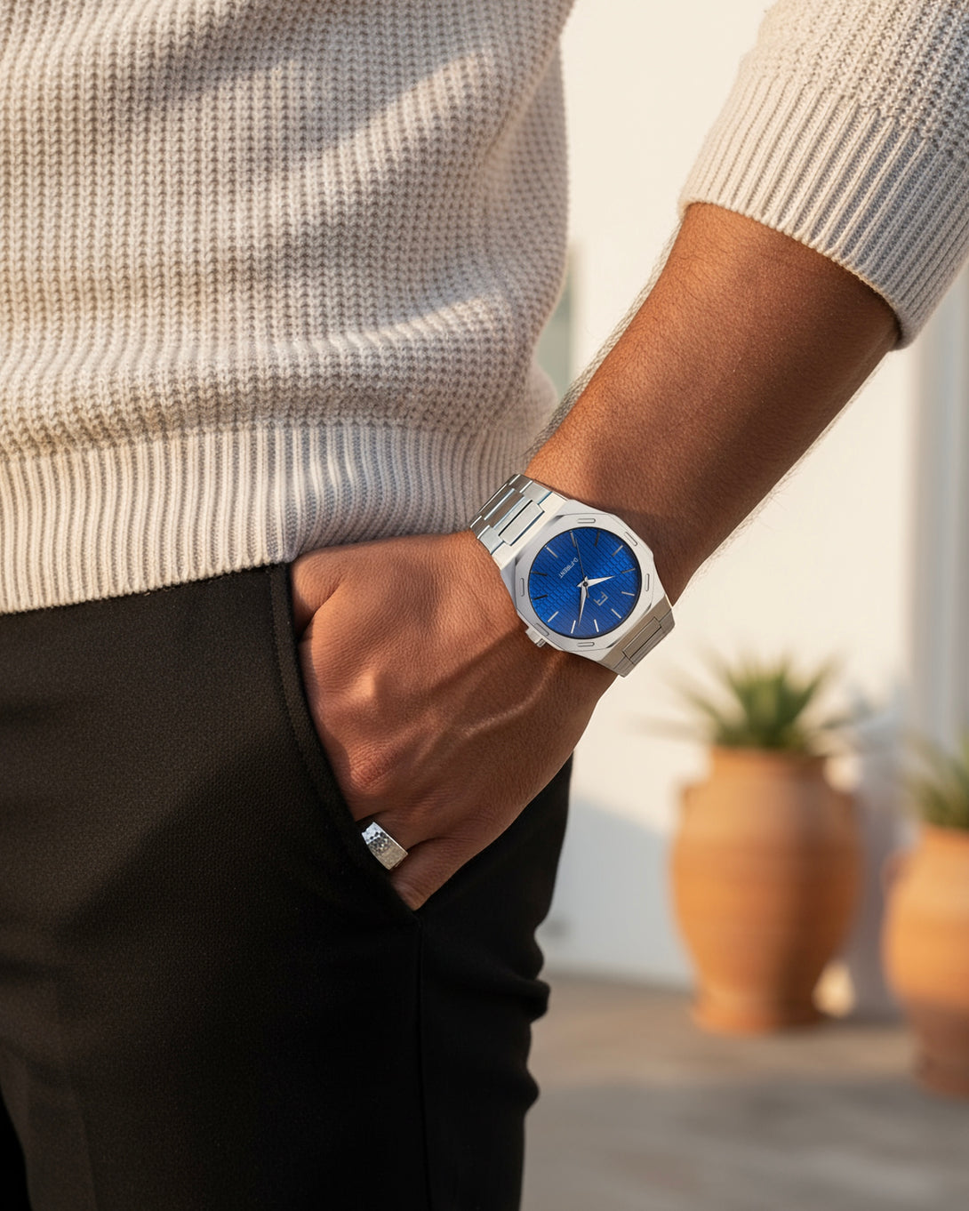 Textured Blue Dial: The 3D sunburst design catches the light beautifully, creating a dynamic visual effect that changes with every angle, further enhancing the watch’s versatile appeal.