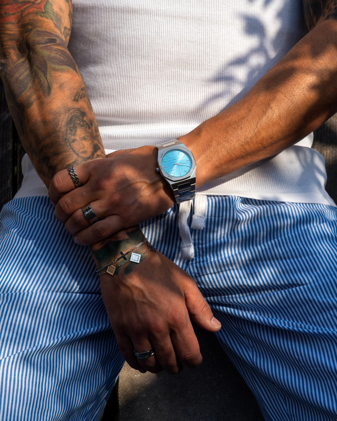 Mykonos Blue Dial: The stunning Mykonos blue dial captures the deep, vivid hues of the Cycladic islands, bringing a refreshing and sophisticated touch to your wrist.